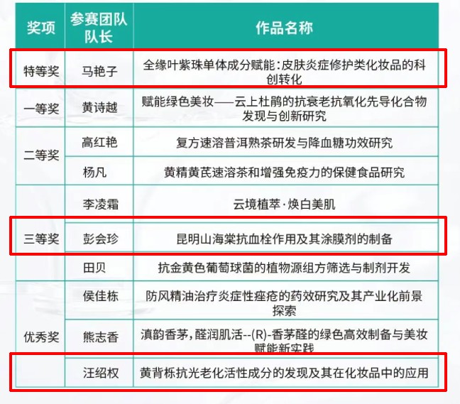 贝泰妮集团研发副总裁、云南特色植物提取实验室副主任王飞飞代表主办方致辞。随后,10支团队依次登场,全方位展现项目的核心价值与创新亮点。经过评审团的严格评审,本次大赛共评选出特等奖、一等奖、二等奖、三等奖及优秀奖五大类奖项。药学院马艳子(博士生)、彭会珍(博士生)、汪绍权(本科生)三位同学带领团队分别荣获特等奖、三等奖、优秀奖。祝贺获奖团队取得优良成绩。