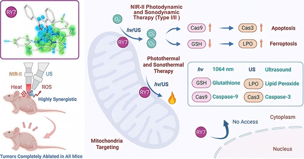 Nine nonemissive Ru(II) complexes have been designed for synergistic NIR-II (1064 nm) photodynamic, photothermal, sonodynamic, and sonothermal therapy targeting cisplatin-resistant nonsmall cell lung cancer. Their quantum yields of singlet oxygen and superoxide anions are significantly elevated under low-power NIR-II laser irradiation or ultrasound treatment. The selected complex RY7 completely eradicated drug-resistant lung cancer tumors in all tested mice when treated simultaneously with NIR-II laser and ultrasound at a minimal drug dosage in vivo and was promptly eliminated from the organism. The application of a single-molecule sensitizer to achieve synergistic NIR-II photodynamic/photothermal/sonodynamic/sonothermal therapy may provide important insights into the treatment of deeply located tumors, tackling tumor hypoxia and addressing the complicated pharmacological mechanisms underlying drug resistance. The two-photon absorption quantum chemical calculations presented in this study may also serve as a powerful tool for the rational design and structure-activity relationship studies of two-photon photosensitizers and optical materials.